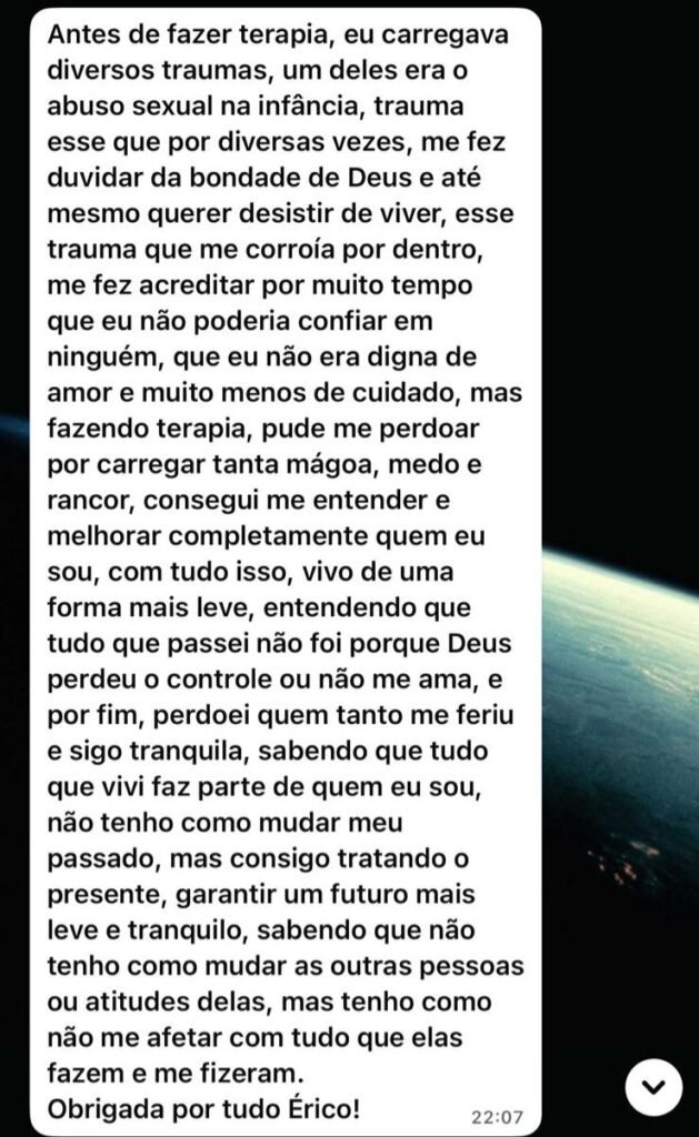 Ao longo de 6 anos, tenho auxiliado pessoas a ressignificarem traumas profundos, transformando dor em aprendizado, maturiade emocional e crescimento saudável dentro da família.